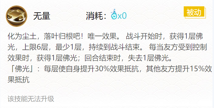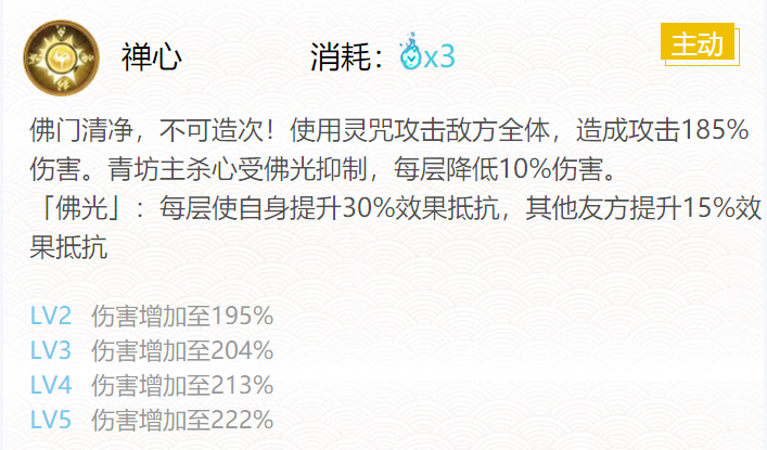 青坊主对阵容的适应性强,搭配幽谷响走辅助,兼具输出,队友可以得到一层佛光,配合被动技能,有很高抵抗率。