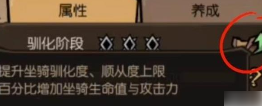 获得了坐骑之后,还能在坐骑页面进行培养。点击坐骑页面的鞍和药水就能进行驯养,开始驯养后会出现驯养度。驯养分为了3个阶段,不同阶段后出现不同的技能。哞哞驯化到3阶段后能够在战斗时给予玩家很多的输出攻击。