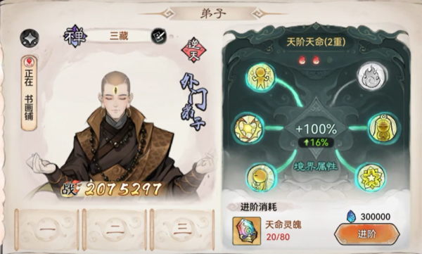 4、在弟子天命升满了之后,可以解锁仙阶的技能,每个弟子满天命需要1400个灵魄碎片。