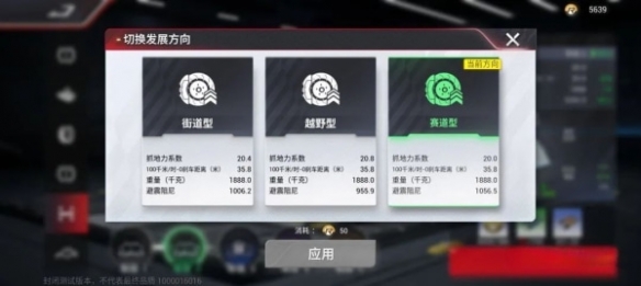 1、赛车的轮胎选择也是比较重要的一环,选择不同属性的轮胎来提速,这样在多样的地图上各种轮胎的特性容易表现出来。