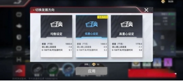 1、车身重心设置方面也有三个方向调整,如果偏向多种路况,玩家选择通用的建议用均衡设定。