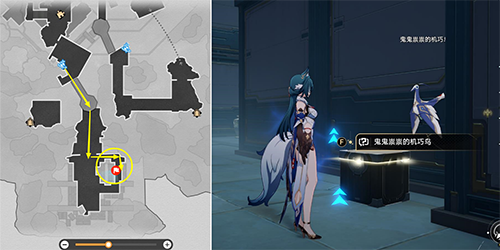 1、首先传送到【幽囚狱-1层】下图位置和【鬼鬼祟祟的机巧鸟】对话,跟前有个宝箱可以顺便拿了。