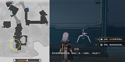 4、然后自动传送到下图位置后,继续和【白鸟】对话【走吧,小心别死在里边】。