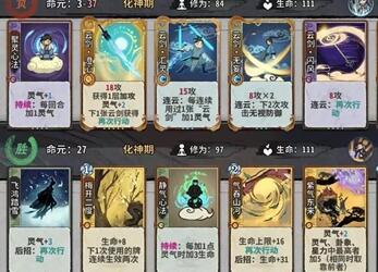 2、在战斗中,我们可以充分燃烧生命上限,借助混元无极阵、水灵印以及暗香等强大的卡牌资源。