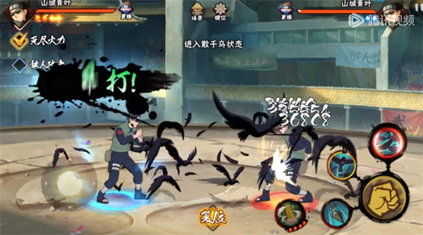 无人能逃脱的一击:山城青叶向前召唤出乌鸦攻击敌人,遮蔽敌人视线。然后并足雷同从鸦群中出现,给予敌人斩击攻击。