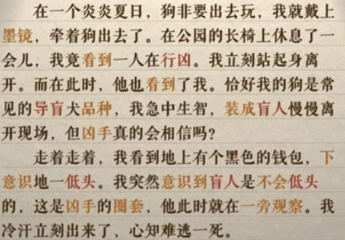 以上就是海龟蘑菇汤黑色钱包通关攻略,玩家需要在游戏中进行填词,首先可以知道戴上墨镜,牵着狗是重点,并且看到一人在行凶,因为狗是常见的导盲犬品种可以装成盲人,但是因为看到地上有个黑色的钱包,下意识地一低头的举动,暴露给凶手真相,串联起整个故事。