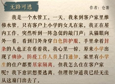 以上就是海龟蘑菇汤无路可逃通关攻略,一个水管工,到客户家里维修水管,只有客户上小学的女儿在,听到敲门声看猫眼,会看到门外穿白色防护服、手里拿封条的人同时对视,小学出现了确诊,防疫工作人员上门通知隔离,不能住在客户家想要逃离但是没有办法了。