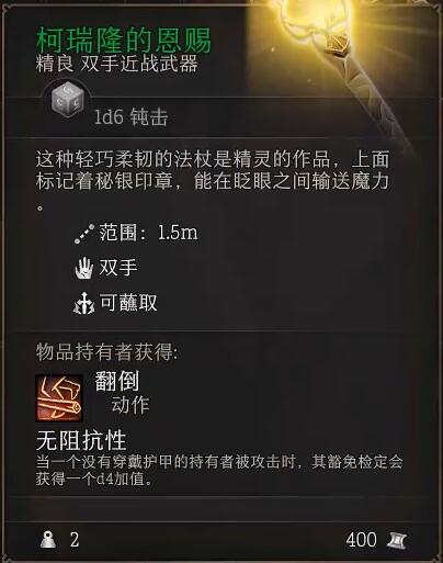 1、柯瑞隆的恩赐:1d6钝击,双手近战法杖:持有者未着甲被攻击时豁免额外增加1d4。